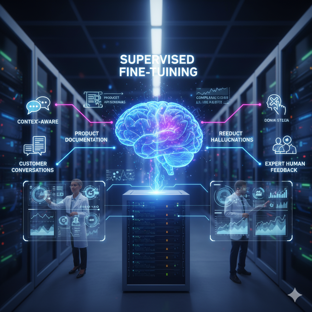 Supervised Fine-Tuning is the process of teaching a pre-trained model to adapt to your domain and use cases. It uses labeled examples—pairs of prompts and correct outputs—so the model learns how to respond in your specific context.